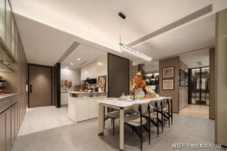 建面约108㎡ 3房,进门以后,就能看到这一排长约4.9米的收纳柜, 包含了玄关柜、嵌入式双开门冰箱、零食抽拉篮、用作“早C晚A”的餐边柜,包括水波纹的柜门、奢石背板、轨道式插座,还有柜子内的隔断……除了可移动的这些软装,都是交标。