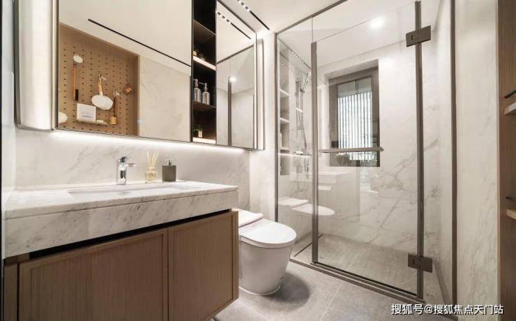 通长镜柜内置插座、牙刷消毒器和各种小物件收纳,主卫则多了一个美妆冰箱。