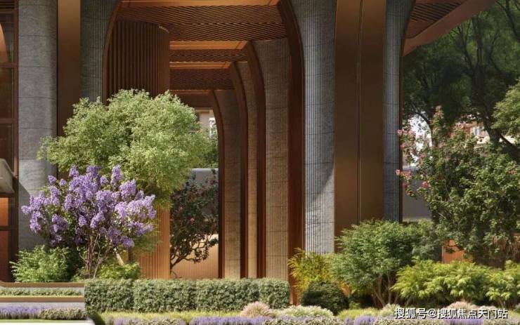 底部以石材和金属结合的曲线异形巨柱抬高建筑体量,构筑了廊柱与动态景观空间,既满足了尊贵的入户大堂需求,又释放了底层空间的潜力,进一步提升了低层住宅的采光效果和视野范围,从而营造出更为宜人的居住环境。