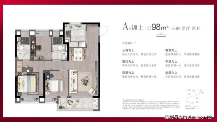 98m²的户型还做了两卫设计,舒适方便,晨起再也不用经历排队洗漱的局促局面,亮点满满!