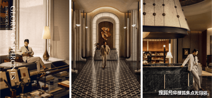 大门两侧,矗立的 巨型花钵,表面镶嵌着来自意大利的“翡翠星河”超薄奢石,蕴藏着如宇宙星痕般的细腻脉络,花钵之上,傲然挺立着远渡重洋而来的 爱知县的老桩茶梅盛迎业主归家。举步徐行,来到致敬金贝尔美术馆打造的 「天穹光廊」,长廊的地面由 蓝翡翠奢石+纯净汉白玉+温润的温德姆灰石材3种奢石,经过精细切割与拼花,复现了香港中银大厦极具几何美学的拼花,中轴对称的庄严格局,将空间升华为博物馆级的艺术殿堂。长廊尽头,对景景墙精选珍罕的 龙纹绿奢石。深邃浓郁的绿色基底上,蜿蜒游走的纹理如神龙遨游九天,尊贵非凡。