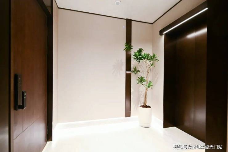 颇具质感的暗色系电梯和入户大门,与浅色墙体形成了强烈的色彩冲击。