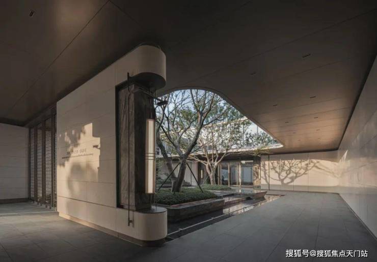 步入社区大堂后,一座叠水庭院成为视觉焦点。水流从阶梯式砂岩平台倾泻而下,与镜面水池相接,形成“声景”与“视景”的双重沉浸。