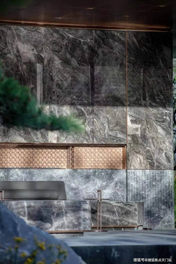 而大华星曜不仅打造了具有曲线美感的树池,还在水景底部铺了数百片蓝钻瓷片,全角度弧形定制,水刀切割,用金属线条勾勒出水波的形状。