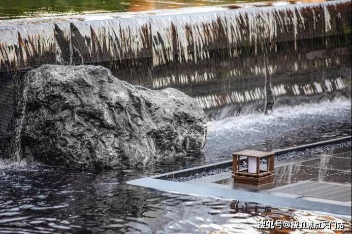 又比如,项目延续了张园“引水入园”的理念, 将长200m近1000m²的水系覆盖到整个社区内。水景形态各异,有中心静水、三层跌水、点状涌泉、立面叠瀑、弧形流水五大不同呈现方式。水系的引入,让整个社区彻底灵动飘逸了起来。