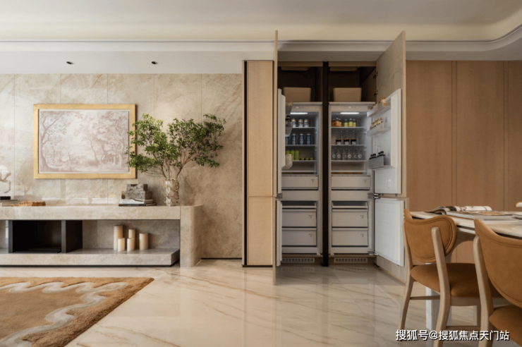 第二,两梯两户的设计,客户能尊享独立电梯厅,这个电梯厅 不仅能完全取代玄关的作用,放伞、挂衣、脱帽、换鞋、清洁等工作都能在进门前全部完成。