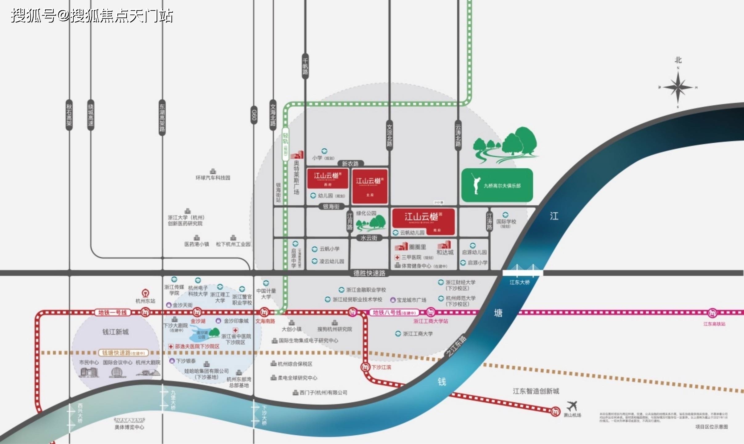 【多维路网】紧邻德胜快速路和钱塘快速路(艮山快速路),横贯杭州东西;地铁1号线延伸段至萧山机场(在建)、地铁8号线至大江东(在建)、长安至下沙轨道交通(规划)等三轨环绕。