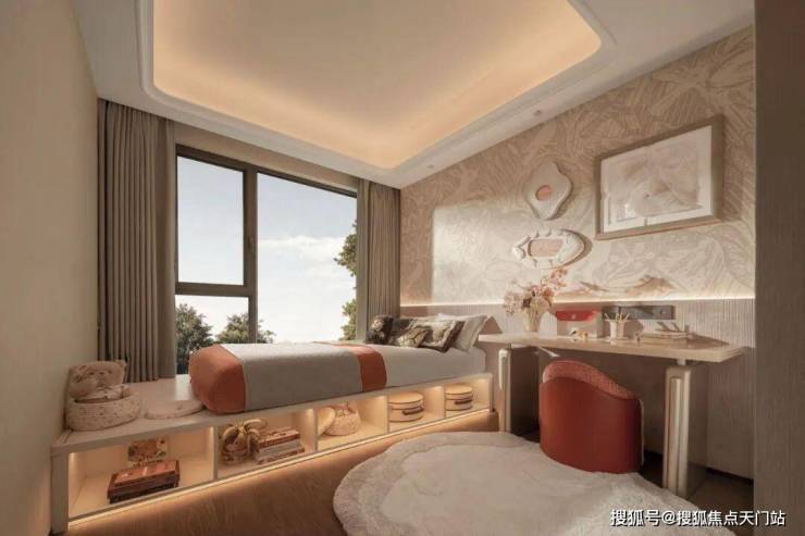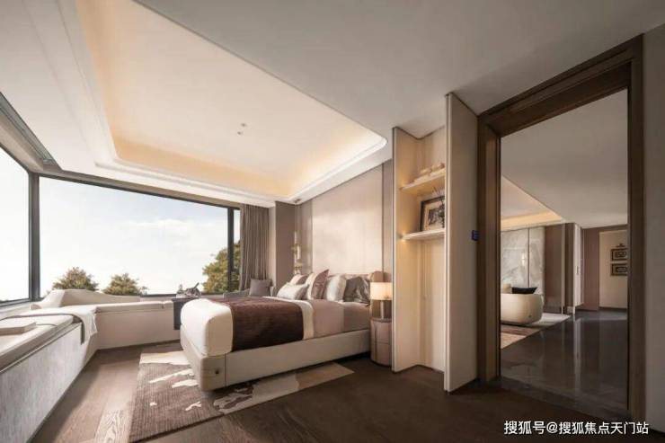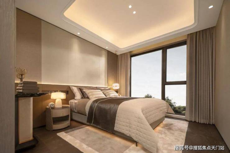 主卧面宽4米,配置2米长的床后还有近2米的空间余量。270°转角飘窗,你坐在飘窗上,左边是公园的绿意,正面是城市的灯火。一本书,一杯茶,一个下午。