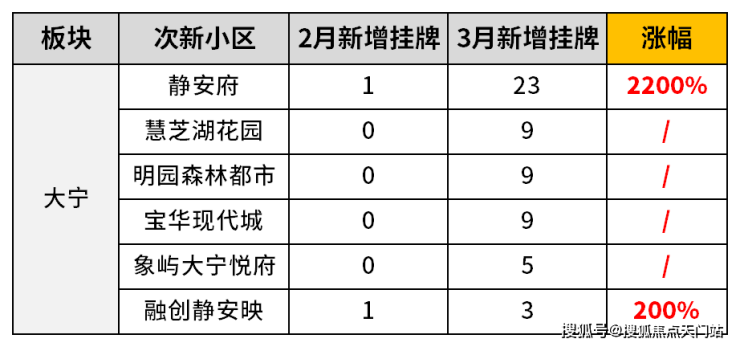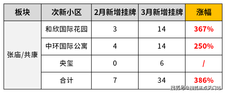 共康/庙行板块2月次新房的新增挂牌套数只有7套,3月直接暴涨至34套,整体涨幅约386%!