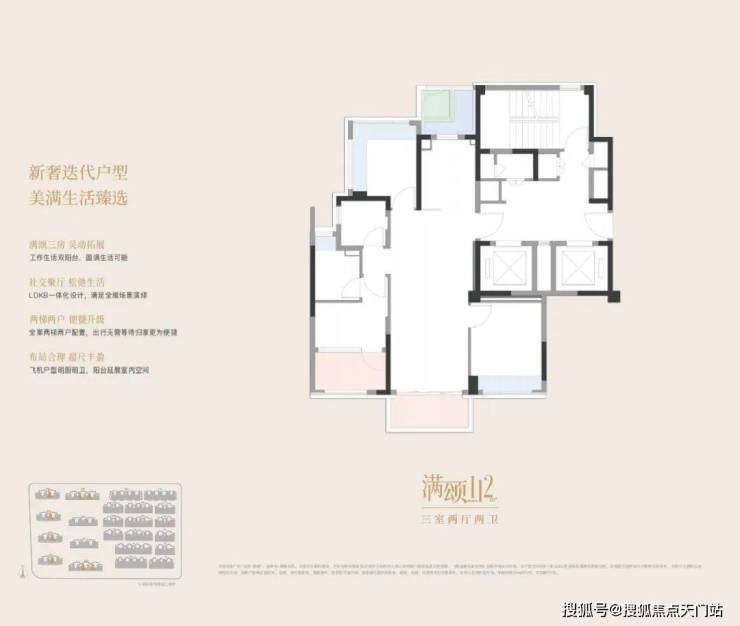 建面约112㎡三房:两梯两户、飞机户型、LDKB一体化、南北双阳台、高面积赠送。