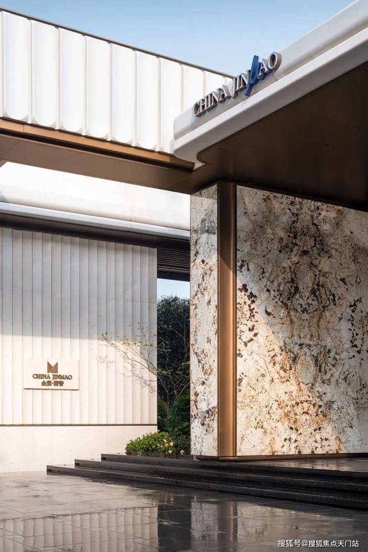 金茂满誉的外立面,是克里姆特金箔立面——月光米黄石材搭配现代弧形铝板,再加上大面落地玻璃。阳光下,整栋建筑泛着温润的金色光泽,像一件可以收藏的建筑艺术品。