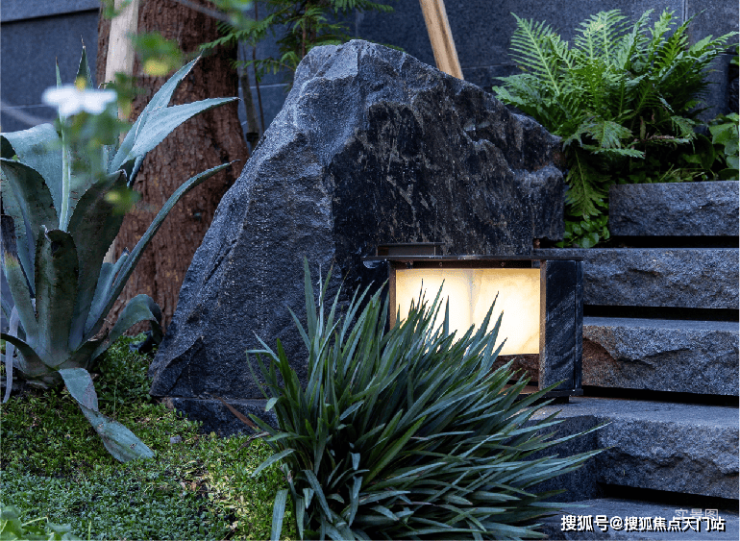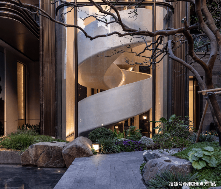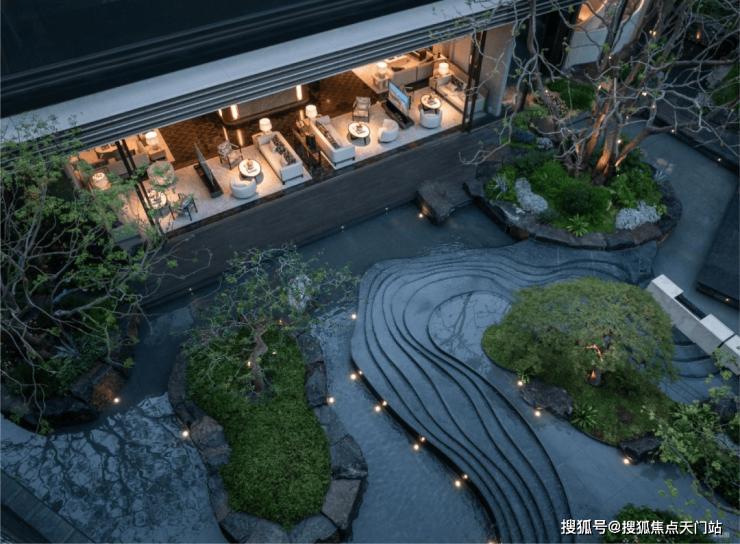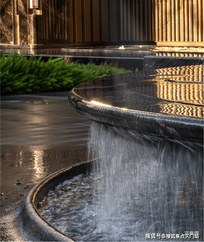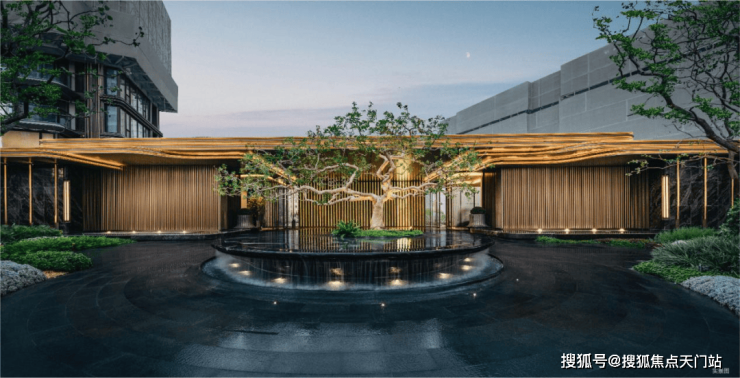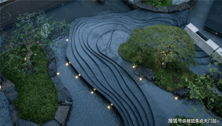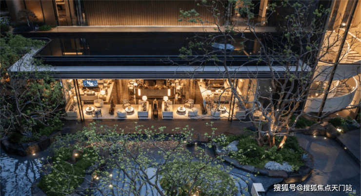 而实景首开的近2000㎡下沉庭院,作为“园林灵魂”,漫步此间,你会看见:乌金原石围合的“玉扣绿岛”上,低调静放着团队自“天下玉源”河南南阳历时遴选而来,近7000年的“国玉”独山璞玉,与山野林木共此氤氲灵气,尽显东方温润;从诗经走出来的近11m高参天乌桕,则再现古诗中所描述的“秋林城郭画图中,乌桕千株照眼红“的诗意;采用约6.7m幻影蓝奢石打造的“叠级水瀑”跌水台,池底以呈现天然墨绿色泽的蓝金刚石铺就,映水之澄明,境之悠远;连台阶都采用了“黑色花岗岩之王”安哥拉黑整石,沿云梯而上,让人返璞内心东方......