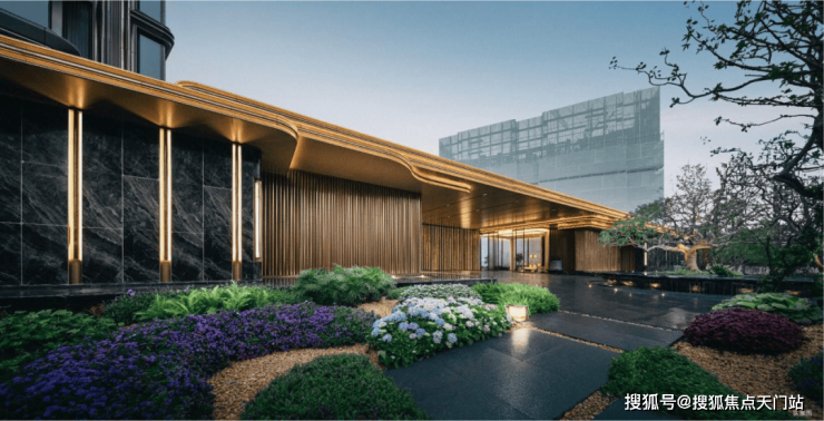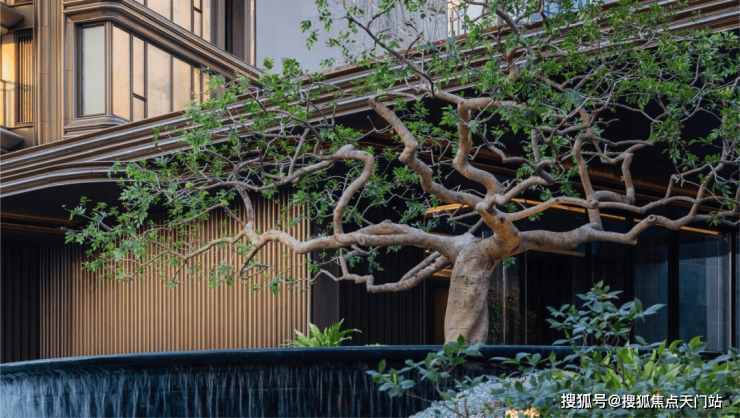 门庭隐现墨绿色泽的「璞熠琉璃」背景墙,经800℃高温淬炼,三十昼夜退火降温,无数遍打磨抛光,光影流转间熠熠生辉;特邀非遗传承人、福记世家第五代传承人夏志平,用十指抟砂古老手工艺独家定制的「璞釉艺陶」,搭配金属釉质感窑花纹理点缀,尽显温润高级。背后为呈现世间至美陶色,一片陶更历经了百次淬炼,配方调整,1280℃高温均匀铺釉。7.5m冠幅的百万级「百年冬青」,乃团队跨越6省17城,百次实地勘察,从近万棵名木中,万里挑一甄选而出,枝干苍劲充满力量;水盘池底的「流金银河」奢石,浓缩着来自宇宙的浪漫,以水刀行纹,让东方的银河让自上而下,层层倾泻。