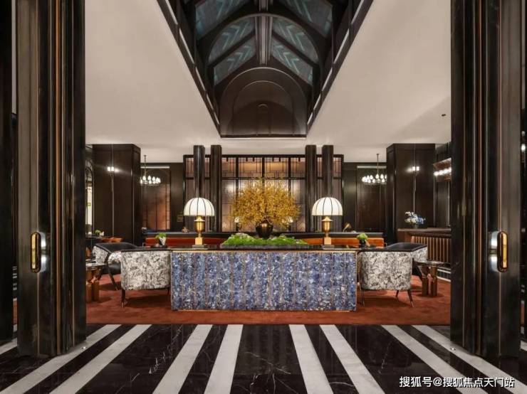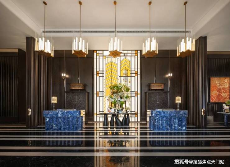 矗立两旁的是进口奢石巴西乌金石打造的大理石柱,庄重典雅。点缀画面中央的是玻利维亚蓝,这是世界上储存量极少的石材之一,被称为奢石中的劳斯莱斯。地面的拼花灵感来自伦敦瑰丽酒店,黑白相间,给我一种神秘厚重的感觉。
