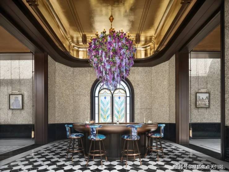 走进落客区,头顶美轮美奂的约300㎡彩色玻璃穹顶,灵感来自于和平饭店,融入老洋房PRADA荣宅的特殊徽章转译。其中 水波纹玻璃、镶嵌玻利维亚蓝奢石带来了丰富的层次感,光影相间的繁复感,仿佛让人步入时光长廊,这样充满艺术性的归家礼仪,让人一眼着迷!
