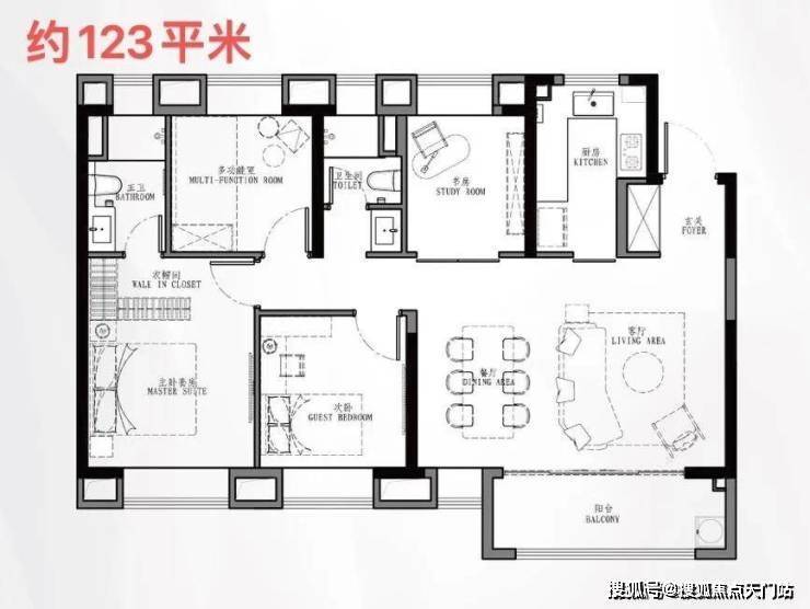123㎡四房两厅两卫,厅更6.3米面宽,可以扩展成多功能空间。