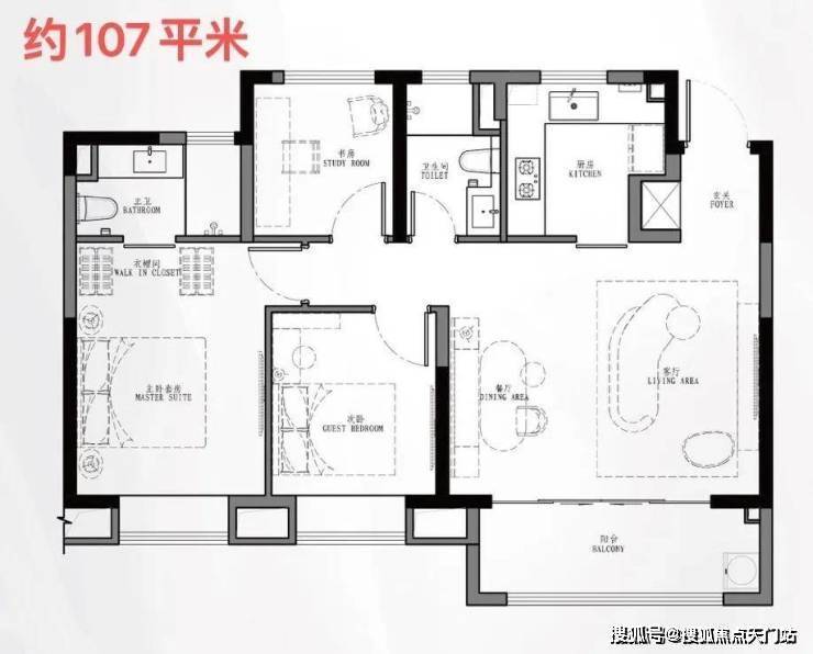 107㎡是103㎡户型的PLUS版,厅面宽达到5.5米。汲取了103㎡户型所有的优点;如餐客厅一体,U型厨房,动静分离设计,大尺度主卧套间,以及每个卧室都赠送大面积飘窗。