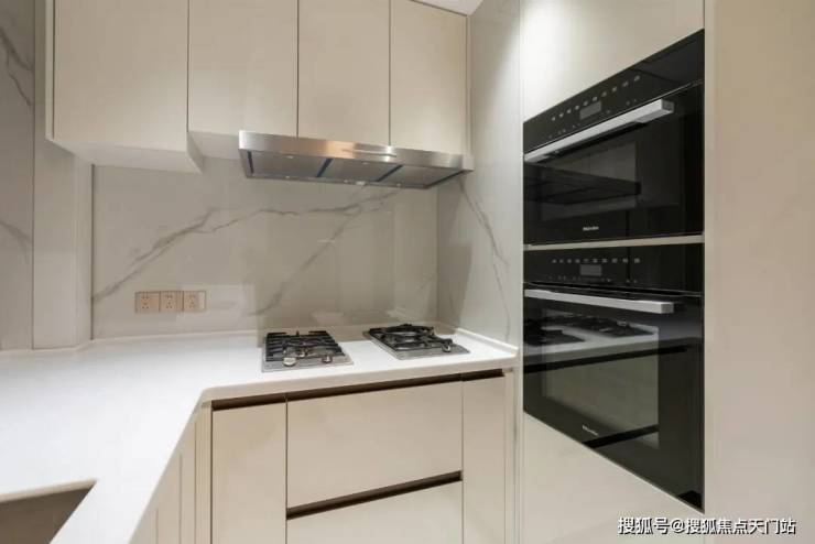 细节方面,项目采用了 拉米娜 的进口电视背景墙、顶级奢侈品牌 卡莉斯塔 的主卫龙头、 ABB 的智能化控制、 LG 的厨房台面,甚至是阳台的 电动晾衣架、水槽、吊柜都是交付标准。