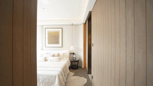 灵感源自孙科别墅的归家仪制与希尔顿酒店的奢贵设计,高达约5米的景墙采用维斯康白和范思哲黑奢石打造,天然深邃的纹理镌刻着门第的荣耀。