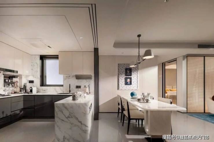 开放式厨房+岛台设计空间更通透!转角抽屉收纳、下拉栏顶部设计反光镜避免视觉死角、轨道插座置于岛台侧墙不占台面空间等等,众多收纳细节思量到位,匠心独运!