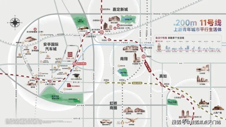 嘉定新城立足打通长三角一体化和虹桥国际开放枢纽的链接通道,构建 “一核一枢纽、两轴四片区”的规划新格局。“一枢纽”即安亭枢纽——以安亭北站、安亭西站为核心,无缝连接虹桥国际开放枢纽,打造站城一体化、辐射长三角的综合交通枢纽。(信息来源:《嘉定新城总体城市设计》)除此之外,上海 2035 规划中的宝嘉线、嘉青松线即将启动,嘉安高速延展嘉定向东,与宝山互通,以安亭为枢纽核心,嘉定再次站在了时代发展的风口之上。