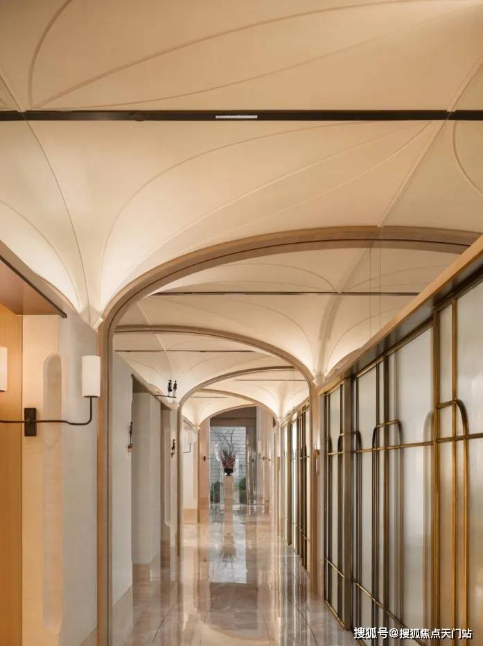 外滩瑞府的 2号楼泛会所,正是华润置地深入洞察这份需求后,给出的精准回应。空间由汤臣一品、翠湖六期同款设计师渡边智昭先生操刀,实际呈现的质感不仅还原了设计师的蓝图,更带来超出预期的惊喜。 整体空间中, 艺术廊道深度融合外滩历史文脉,顶部石材切割出流畅的圆弧转角,与地面弧形线条相互呼应 , 行走其间宛如置身艺术展馆,每一步都藏着底蕴,这种经典设计语言让空间越住越耐看,经得起时间考验。