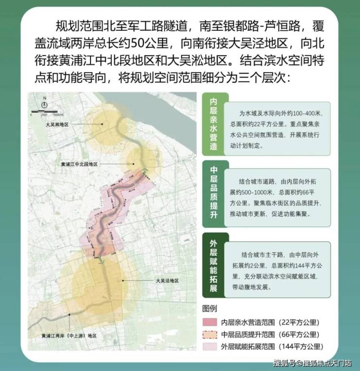 本次规划聚焦滨水岸线的人民性,进一步提升公共空间环境品质和文旅体商等公共服务功能,并强化与腹地单元空间的产业和功能一体谋划。明确规划范围北至定海路-军工路,南至银都路-芦恒路,覆盖流域全长约50公里,涉及杨浦、虹口、黄浦、徐汇、闵行、浦东6个行政区,向南衔接大吴泾片区,向北衔接黄浦江中北段地区和吴淞创新城。