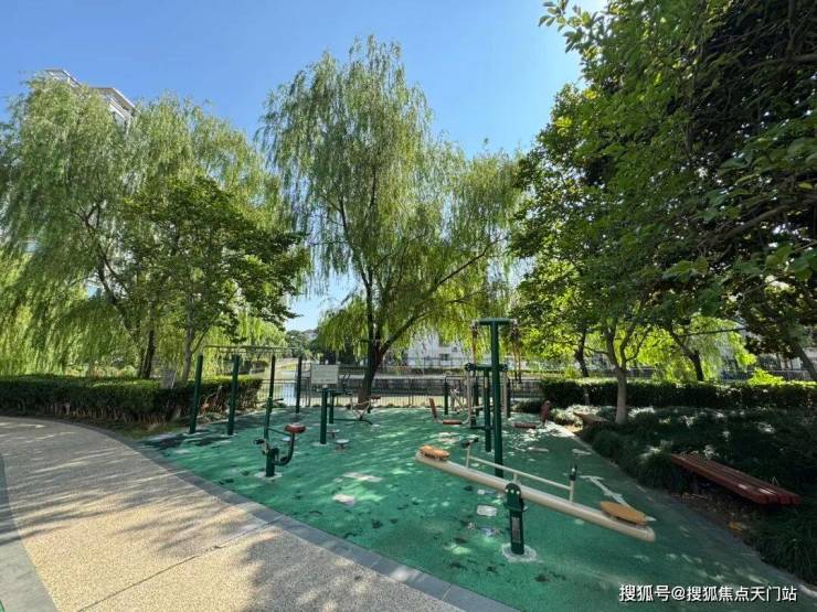 因为小区临河而建,西南侧的楼盘全都是水景房,小区内也配置了沿河步道,活动区就在步道旁,边欣赏河景边健身,确实惬意。