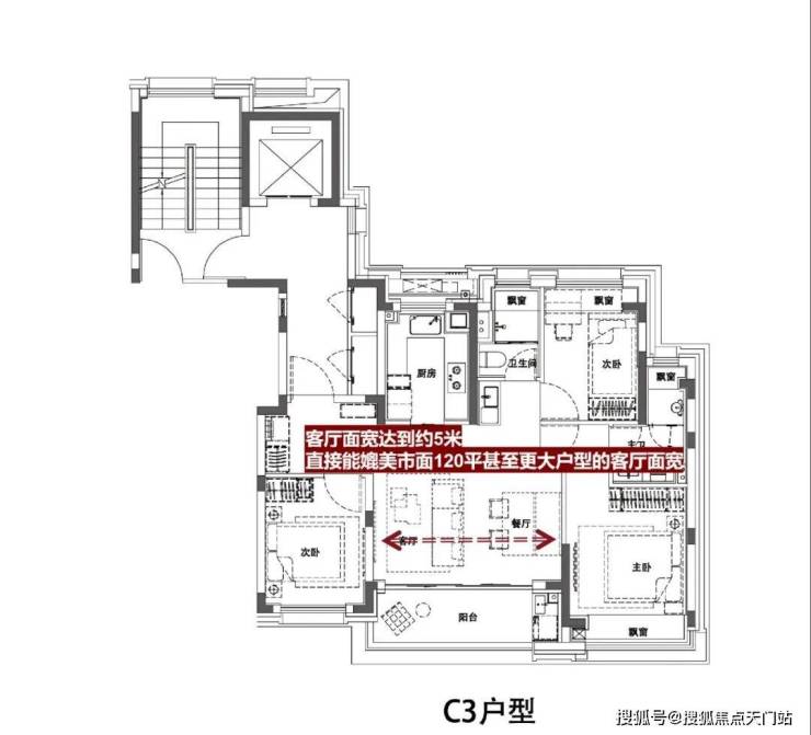 稀缺尺度的宽厅体验:客厅面宽达到约5米,这种尺度的面宽通常出现在约120㎡以上的户型,这次项目约102㎡的户型就能越级享受改善户型的待遇,可见项目在产品上是下足了功夫的。
