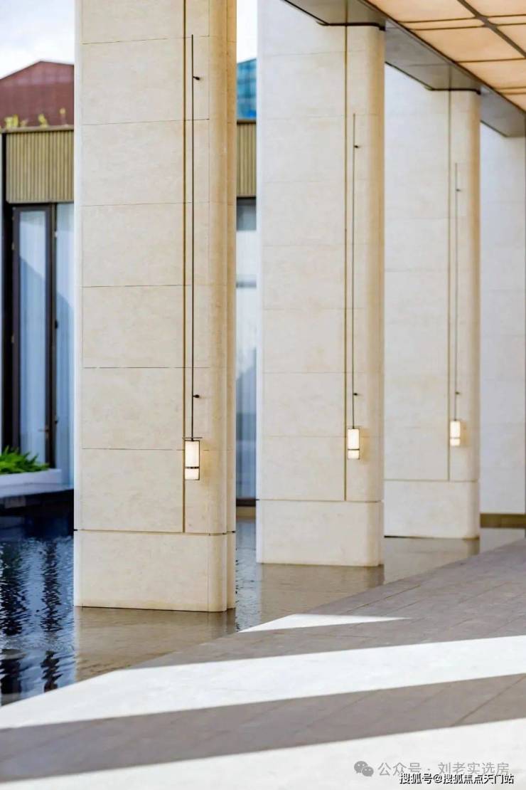 顶部定制发光云石亚克力与圆弧形的古铜色铝板交相辉映,8个西班牙宫殿沉香米黄石柱提升了尊崇感 ,漫步其间,揽风入怀,树影斑驳映入眼帘,水声潺潺入耳,归家的轻松感油然而生,笔者随手一拍,都非常的出圈。
