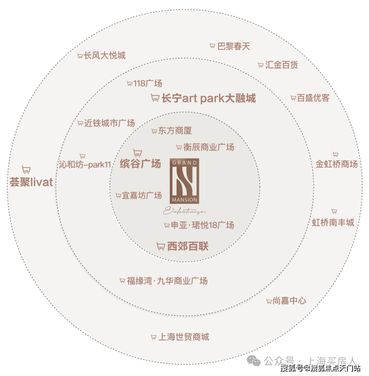 商业方面:北新泾站上盖规划约5万㎡商业综合体,与周边百联西郊、缤谷广场形成“15分钟消费圈”,辐射临空经济园区高净值人群。步行700米至百联西郊购物中心(重装开业),1站地铁至威宁路站缤谷广场,2站至中山公园龙之梦。3公里内覆盖古北黄金城道、ART PARK大融城等高端消费圈。