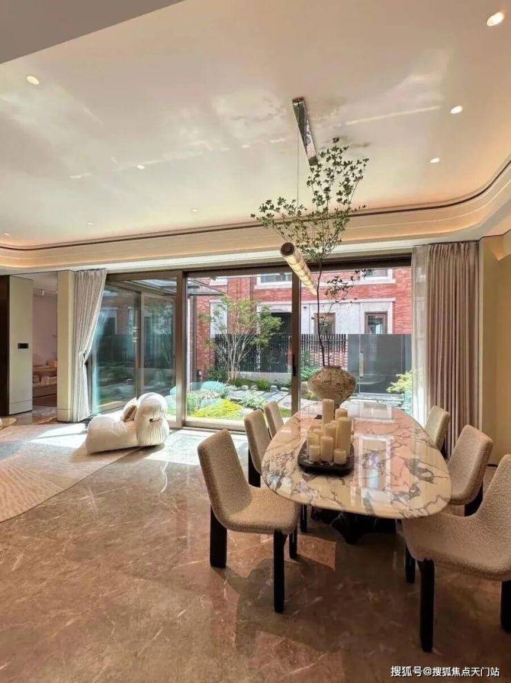 「无界空间」:客厅270度转角无柱设计,搭配落地玻璃,开阔视野将院中风景迎入日常。