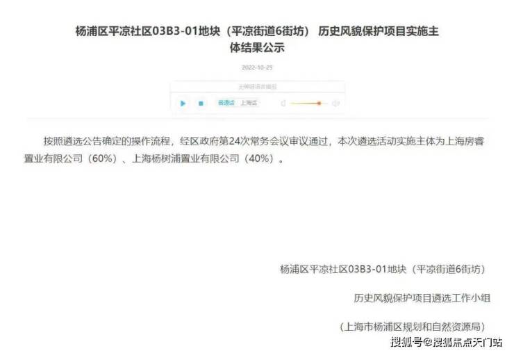 2022年10月25日,杨浦区人民政府官网发布公告,杨浦区平凉社区03B3-01地块(平凉街道6街坊)历史风貌保护项目实施主体结果公示:“本次遴选活动实施主体为上海房睿职业有限公司(60%)、上海杨树浦置业有限公司(40%)。”