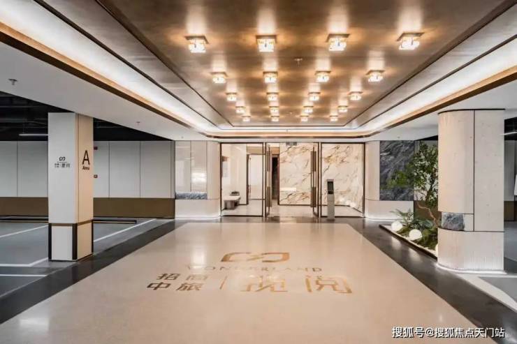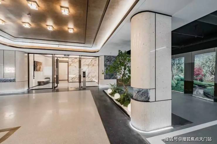 入户大厅的部分外墙上也采用香槟金与部分灰色石材,门头雨棚采用香槟金色弧形装饰,搭配大玻璃面,尊崇感呼之欲出。