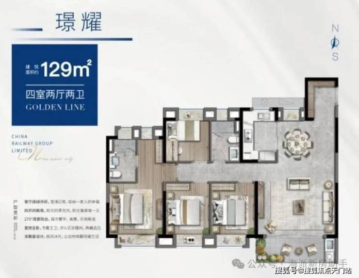 建面约129㎡,实现4房功能性,匹配当下越来越多的二胎和三代同堂家庭!格局上实现了惊人的四开间朝南,约4.8米大开间客厅,客餐厨一体化,外接观景阳台,尺度感爆棚!
