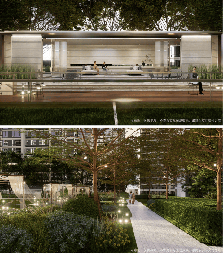 社区景观上,营造“一轴一心三主题”全龄共享的园林空间,让业主沉浸式体验更具松弛感的邻里生活。