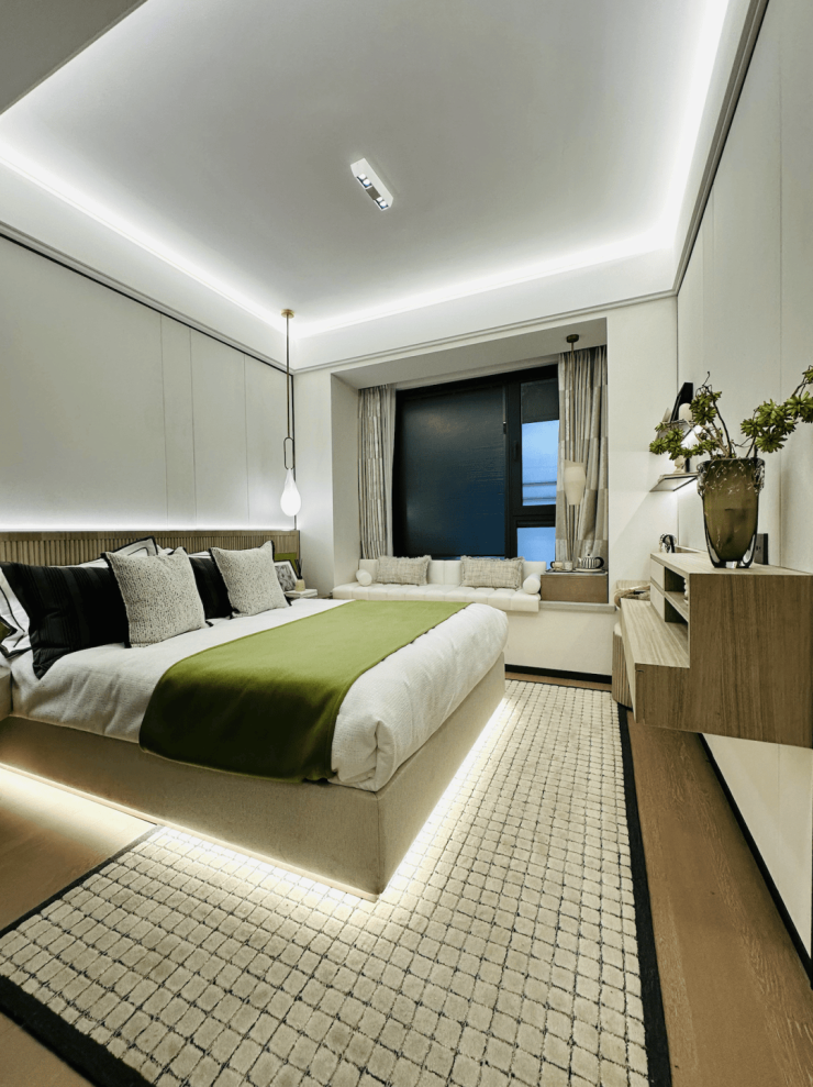三开间朝南+大尺度景观阳台,视野开阔,全明通透,享受四季温馨阳光。卧室飘窗设计,进行个性化的装点,成为一方专属空间。