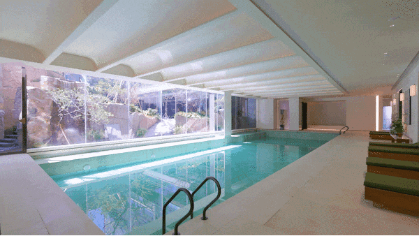 同时,这里还有恒温泳池,泳池配有大面玻璃幕墙!