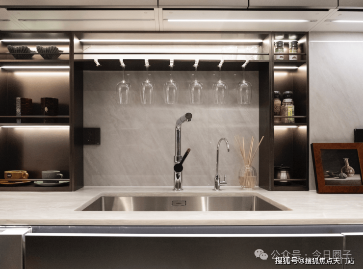 比如说餐边柜+操作台+洗手台一体化设置,让这个空间不再单独的满足于简单的吃饭、客厅休憩。