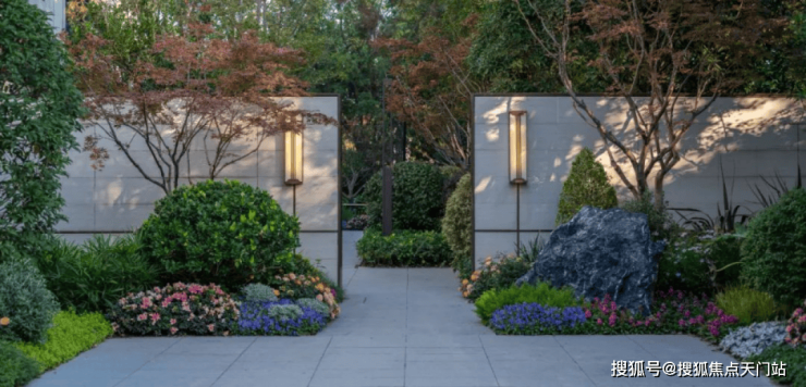选用温润典雅的天然石材作为基底,中轴对称式布局彰显高门气魄,水景内涌泉汨汨且搭配泛星灯光,转角处的精美艺术景墙,邂逅尊崇归家仪式感。