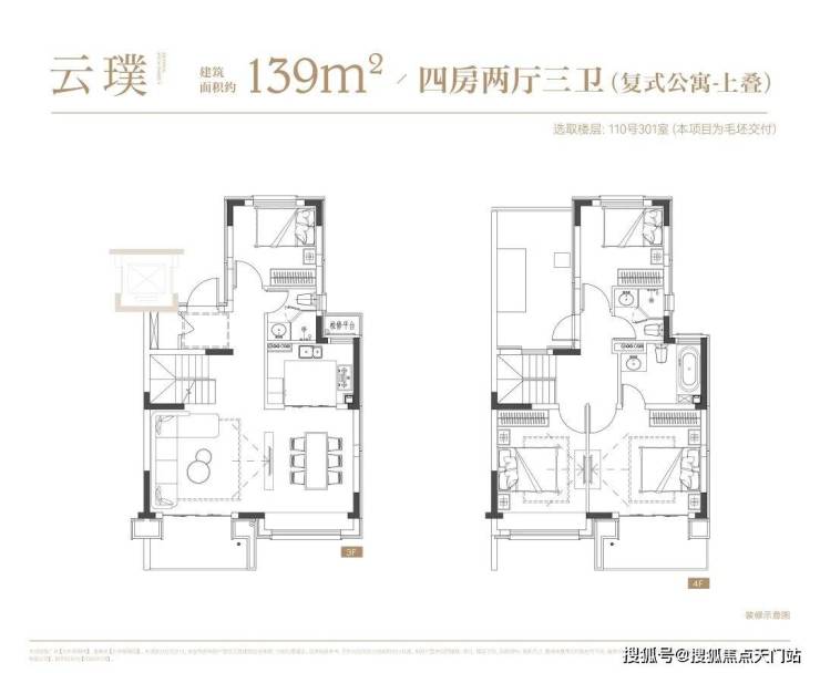 叠墅:叠墅一共四层,分为上/下叠,上叠建筑面积约139㎡,下叠建筑面积约142㎡。