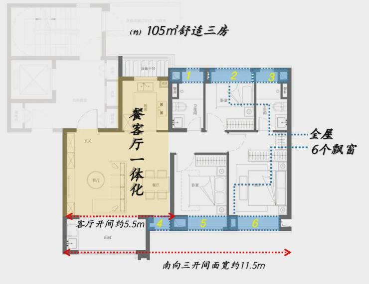优越的窗墙比,可以最大限度将优美的景观纳入眼帘;南向三开间面宽更是达到了约11.5米,可以说市场同户型面积段产品很难做到这样极致化;功能房间以舒适度为导向服务生活,尺度均做到了当下主流产品水平之上;并且全屋附赠6处飘窗,高附加值令人心动。