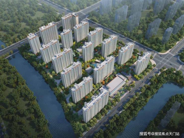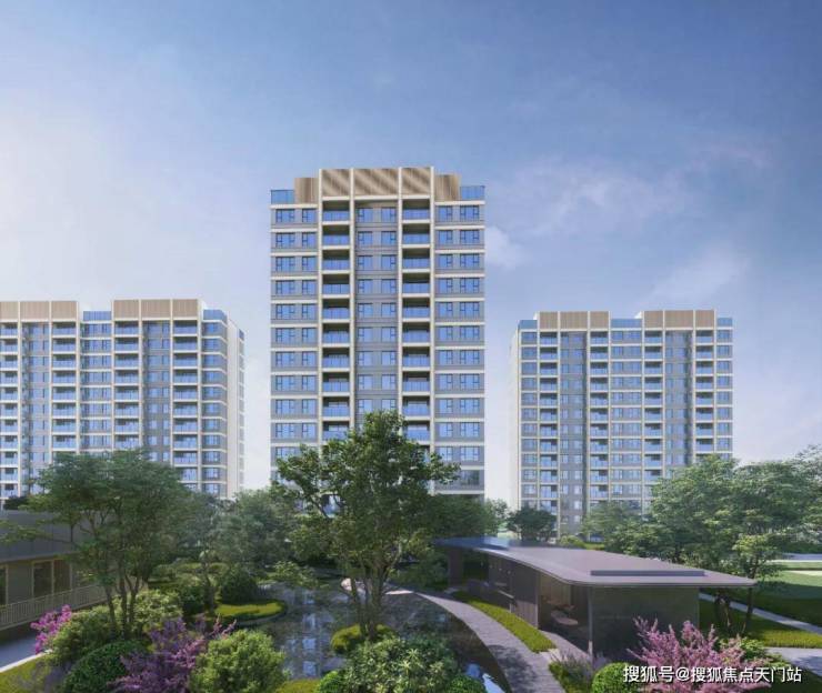 项目建筑为现代典雅风格,外立面采用多彩真石漆+香槟金色铝合金线条,顶部的塔冠设计是标志性特点。