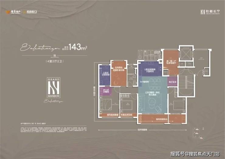 建面约143㎡的4房户型, 类一梯一户的设计 ,每一户都有一个面积约8㎡的独立采光电梯厅空间;四开间朝南+大宽厅,采光效果爆棚;通过LDKB一体化设计,形成一个近50㎡的客餐厅空间,极大提升空间场景的可能性;卧室也采用了酒店化套房设计,主卧贯穿南北套房设计,南北皆有飘窗。