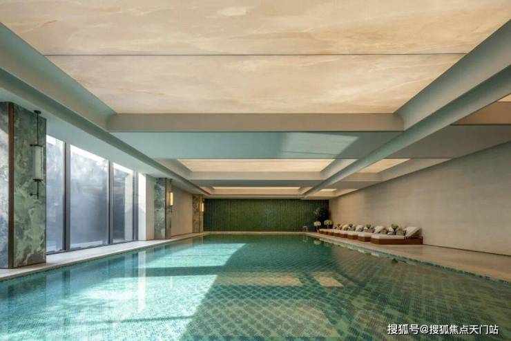 恒温泳池池壁,由工匠手工完成每一片菱形的精准铺贴。当水流轻抚过奢石景墙与温润的烤漆面,光影便在此交织流转,构筑出一个静谧而极具质感的沉浸世界。