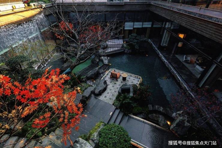 巧妙利用地块天然的高差,一座气势沉静的超长瀑布应运而生,水流声将城市的喧嚣温柔隔绝,营造出穿行于都市幽谷般的沉浸感。