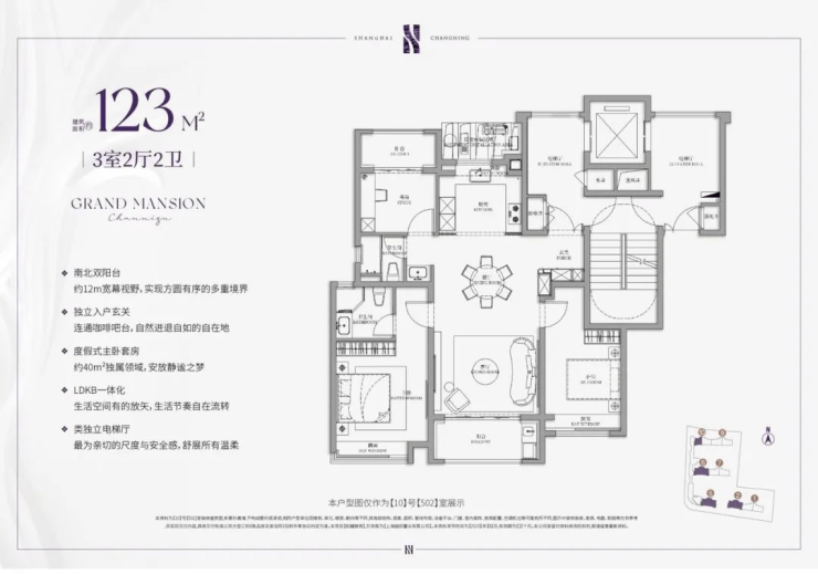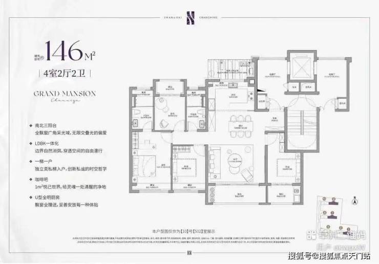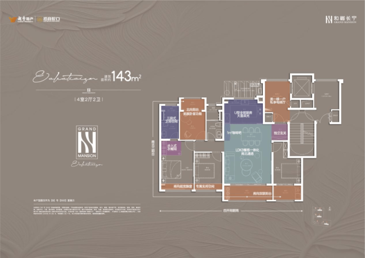 建面约143㎡的4房户型,类一梯一户的设计,每一户都有一个面积约8㎡的独立采光电梯厅空间;四开间朝南+大宽厅,采光效果爆棚;通过LDKB一体化设计,形成一个近50㎡的客餐厅空间,极大提升空间场景的可能性;卧室也采用了酒店化套房设计,主卧贯穿南北套房设计,南北皆有飘窗。