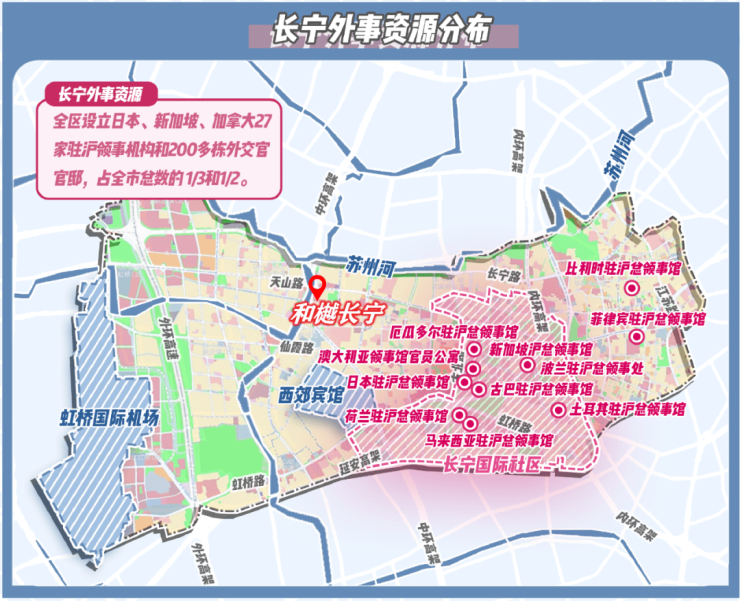“外事客厅”的独一份定位,离不开长宁独一份的国际交通枢纽优势。作为全上海仅有与虹桥机场、高铁站“双枢纽”直接接壤的城区,其核心区域通过轨道交通、快速路网构建起“15分钟国际通勤圈”。
