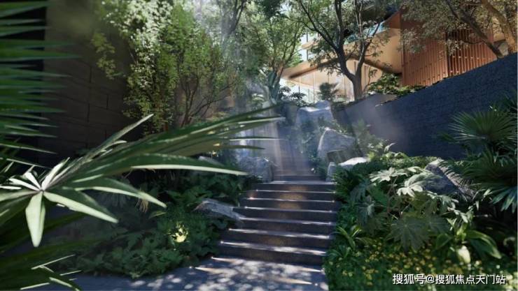园林首创近7米垂直高差的“立体峡谷景观”,结合 5-8.3米全架空层,形成 14米高差的全龄剧场,将山川溪谷引入都市核心