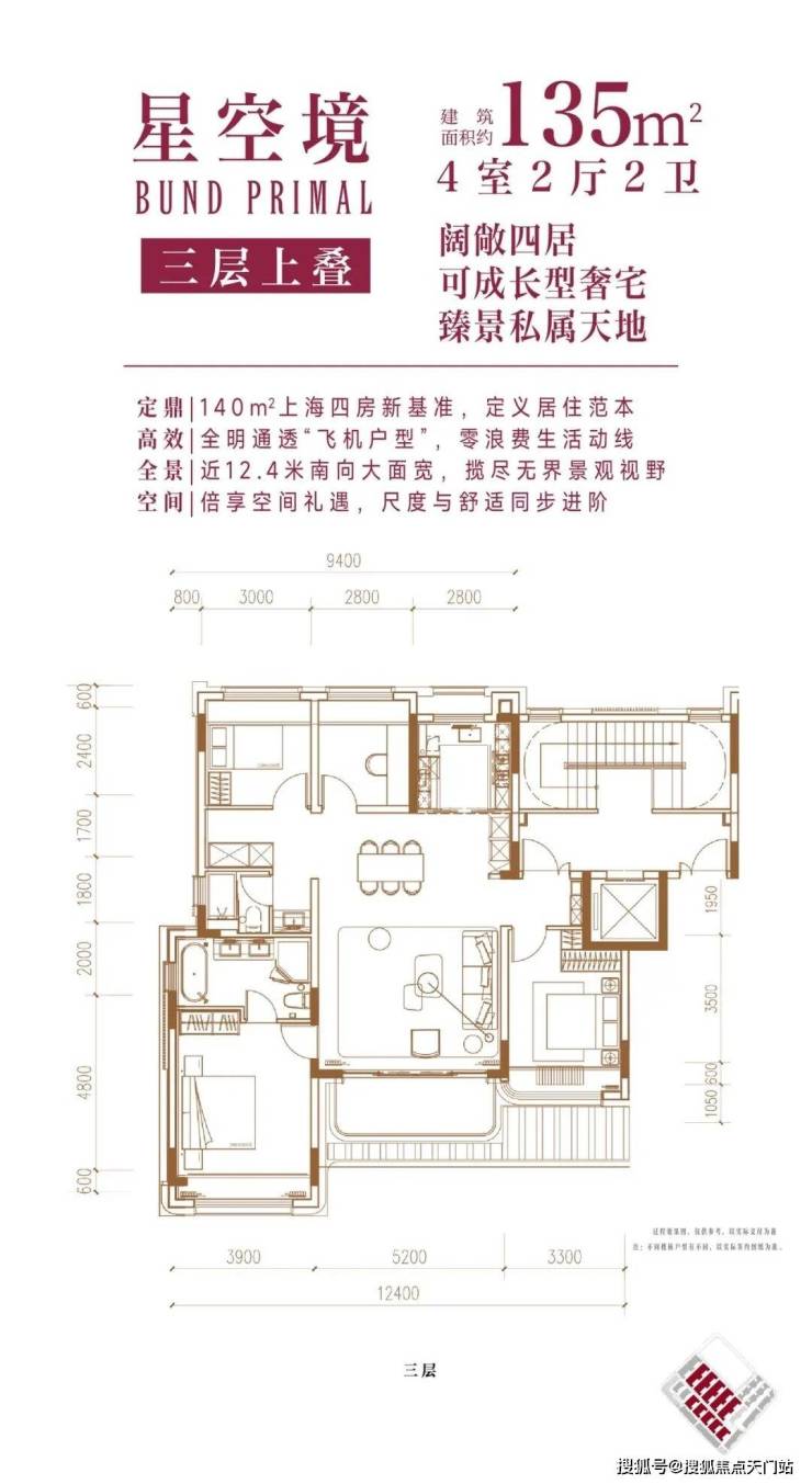 三层户型南向面宽一致,约12.4米,其中客厅面宽约5.2米,主卧面宽约3.9米;三层户型的区别,在于层层退台造成的进深逐层有所减少。